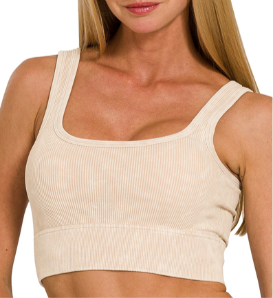 Square Neck Acid Washed Seamless Rib Bralette w/ Removable Pads