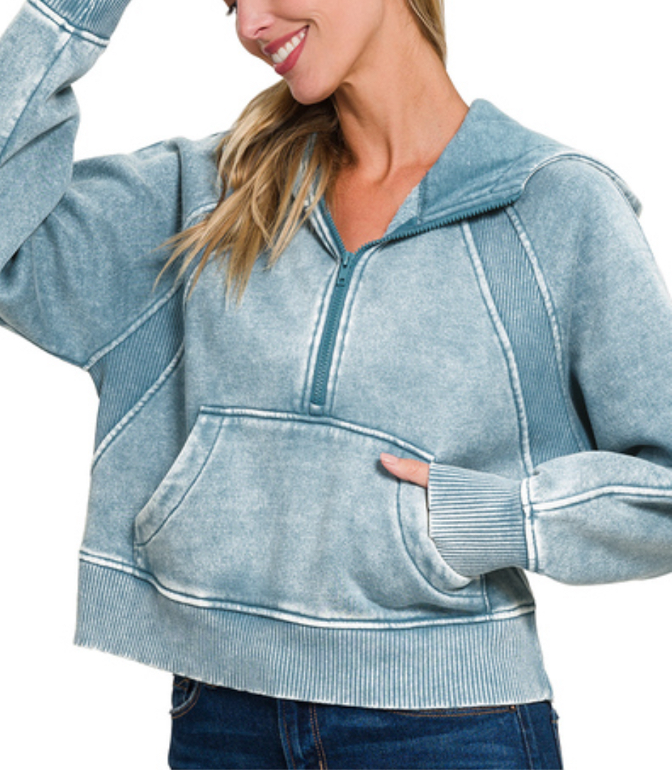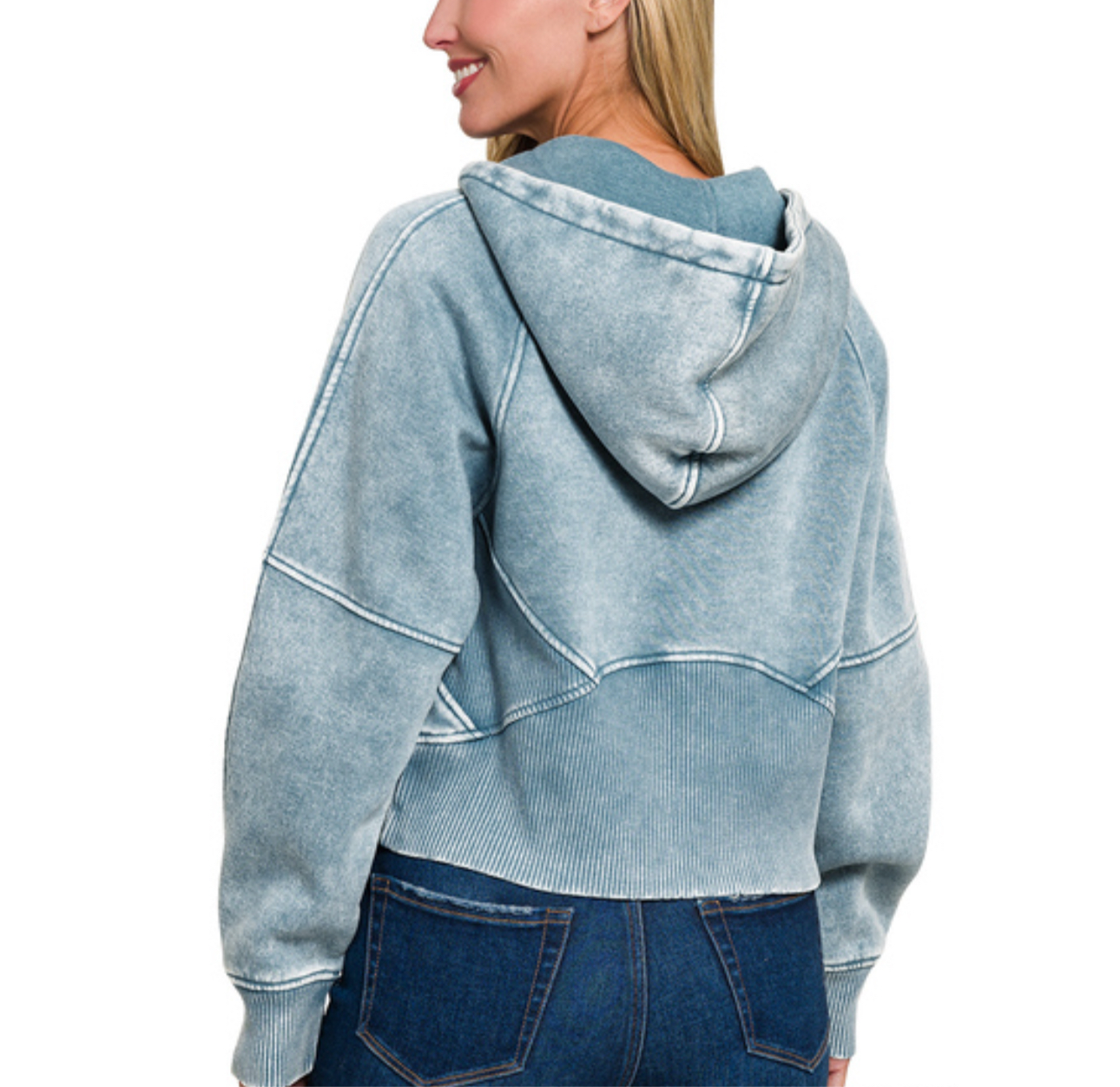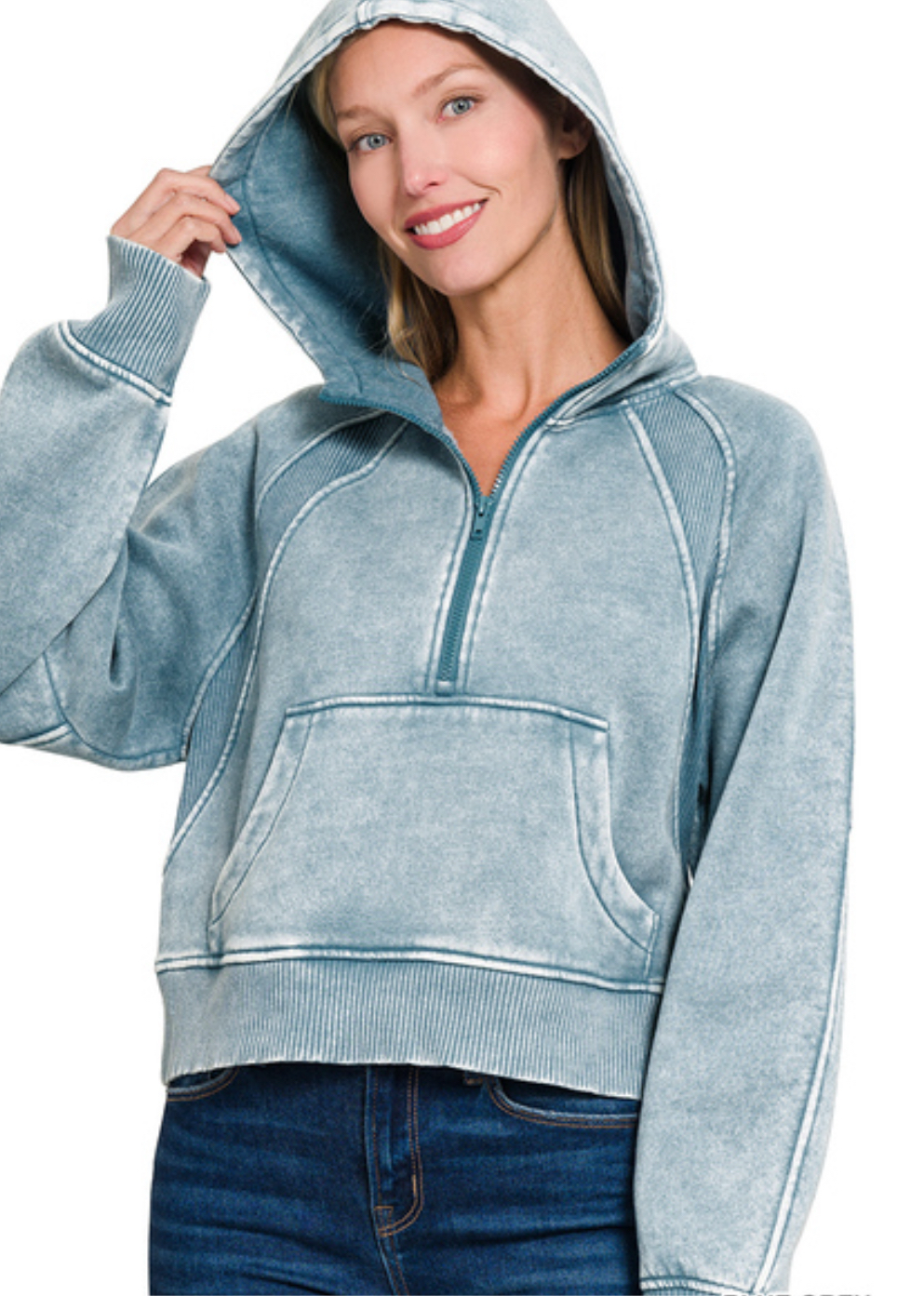 Acid Wash Fleece Half Zip Cropped Hoodie