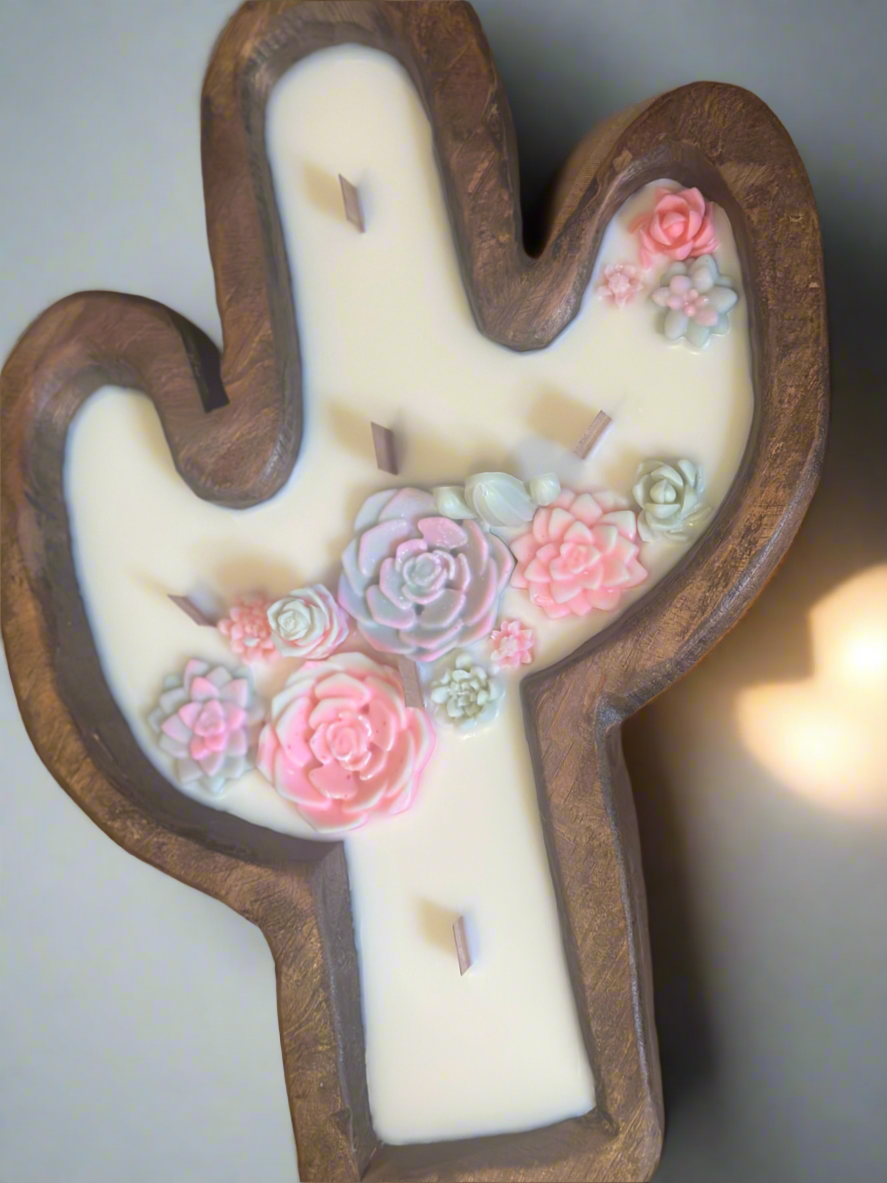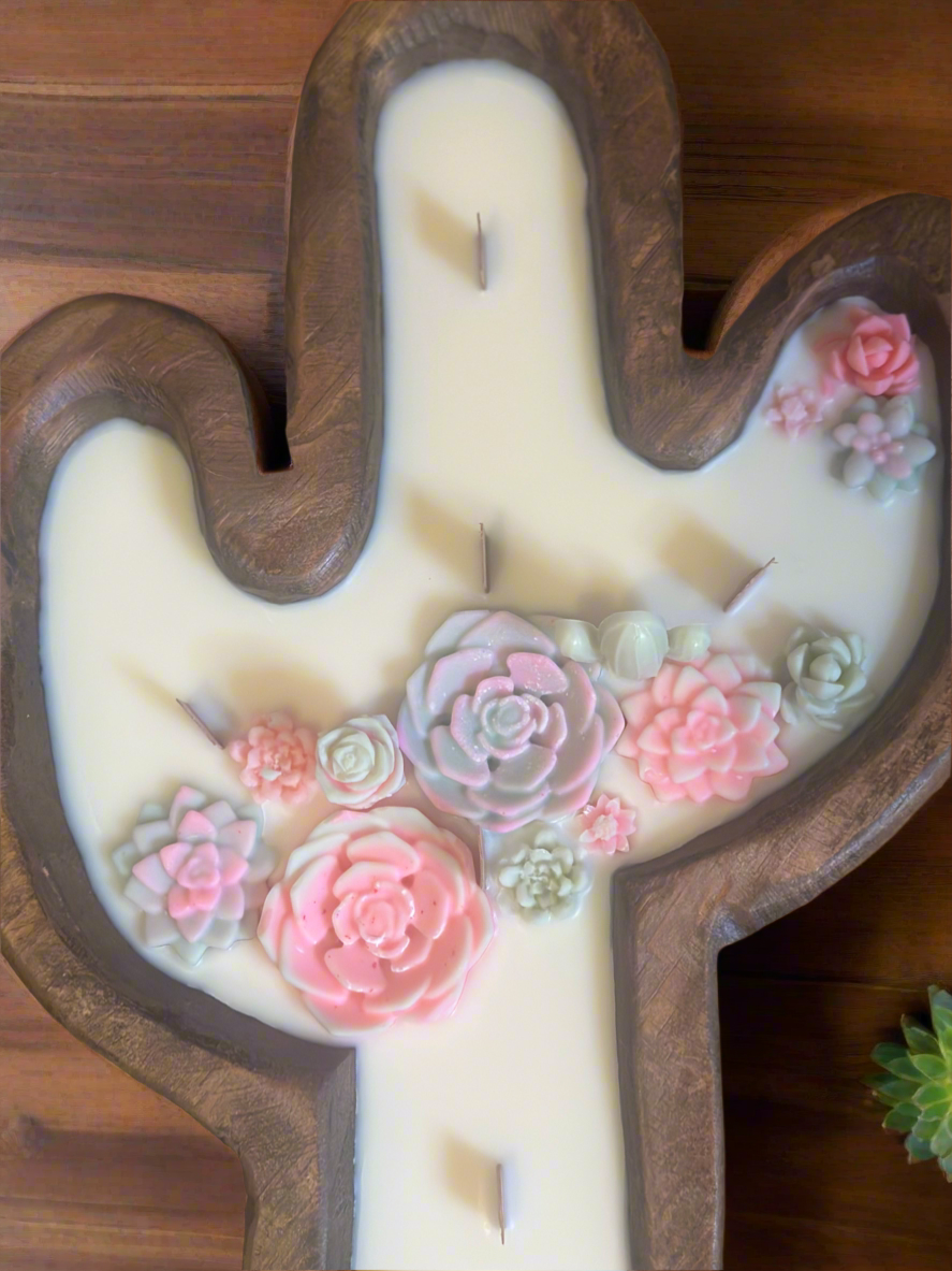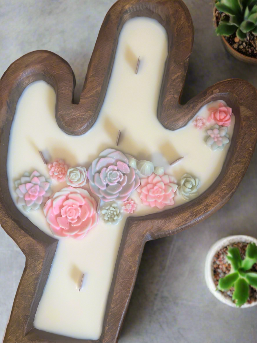 Bring the beauty of a cactus garden into your home with the What The Succulent Candle. This unique, hand-carved wooden bowl holds a stunning arrangement of wax flowers and succulents, offering a beautiful aesthetic design paired with an inviting fragrance.