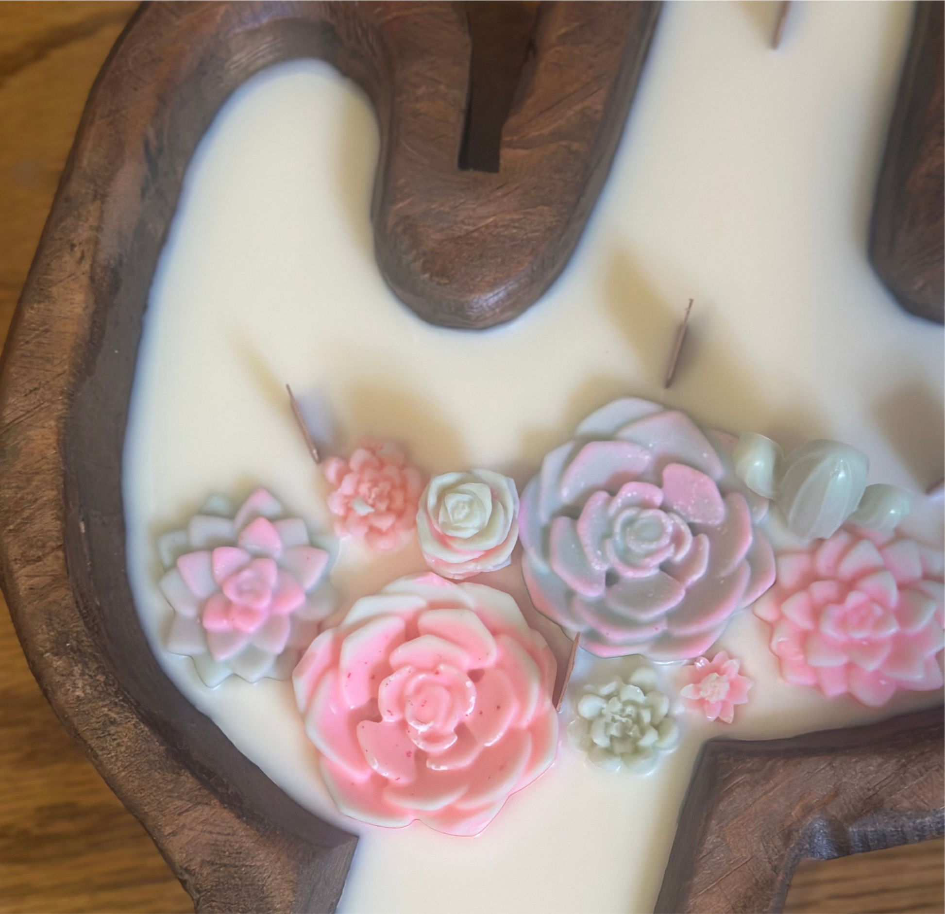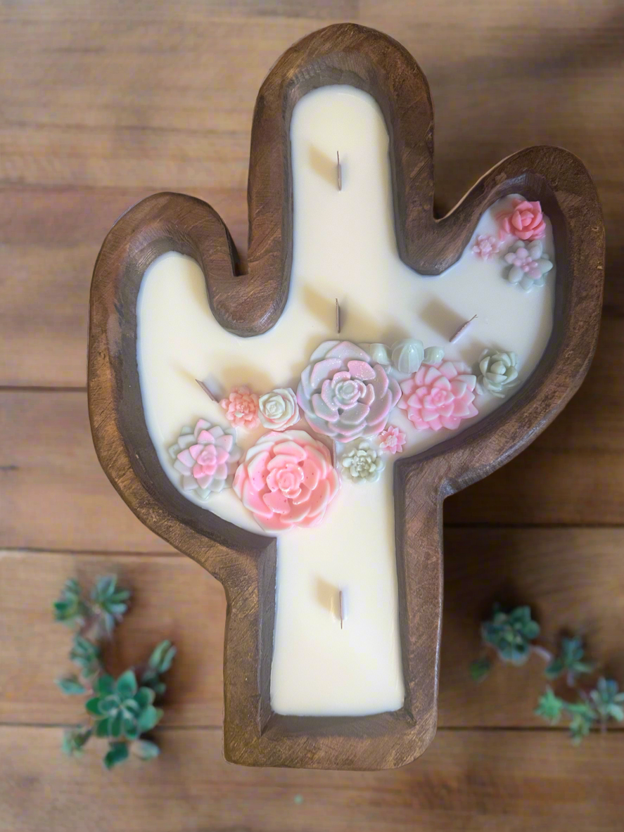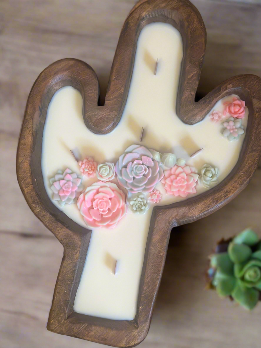 Bring the beauty of a cactus garden into your home with the What The Succulent Candle. This unique, hand-carved wooden bowl holds a stunning arrangement of wax flowers and succulents, offering a beautiful aesthetic design paired with an inviting fragrance.