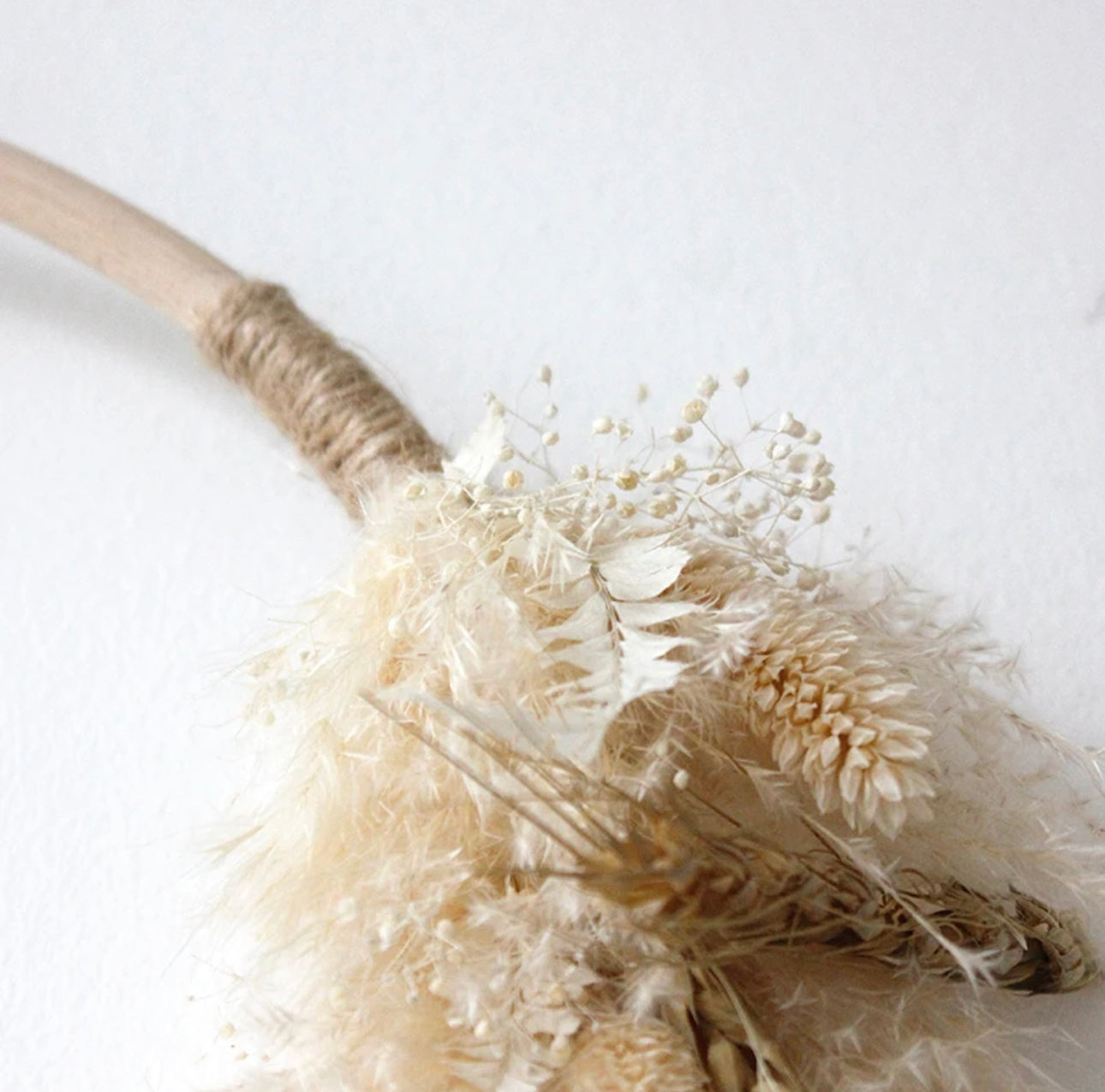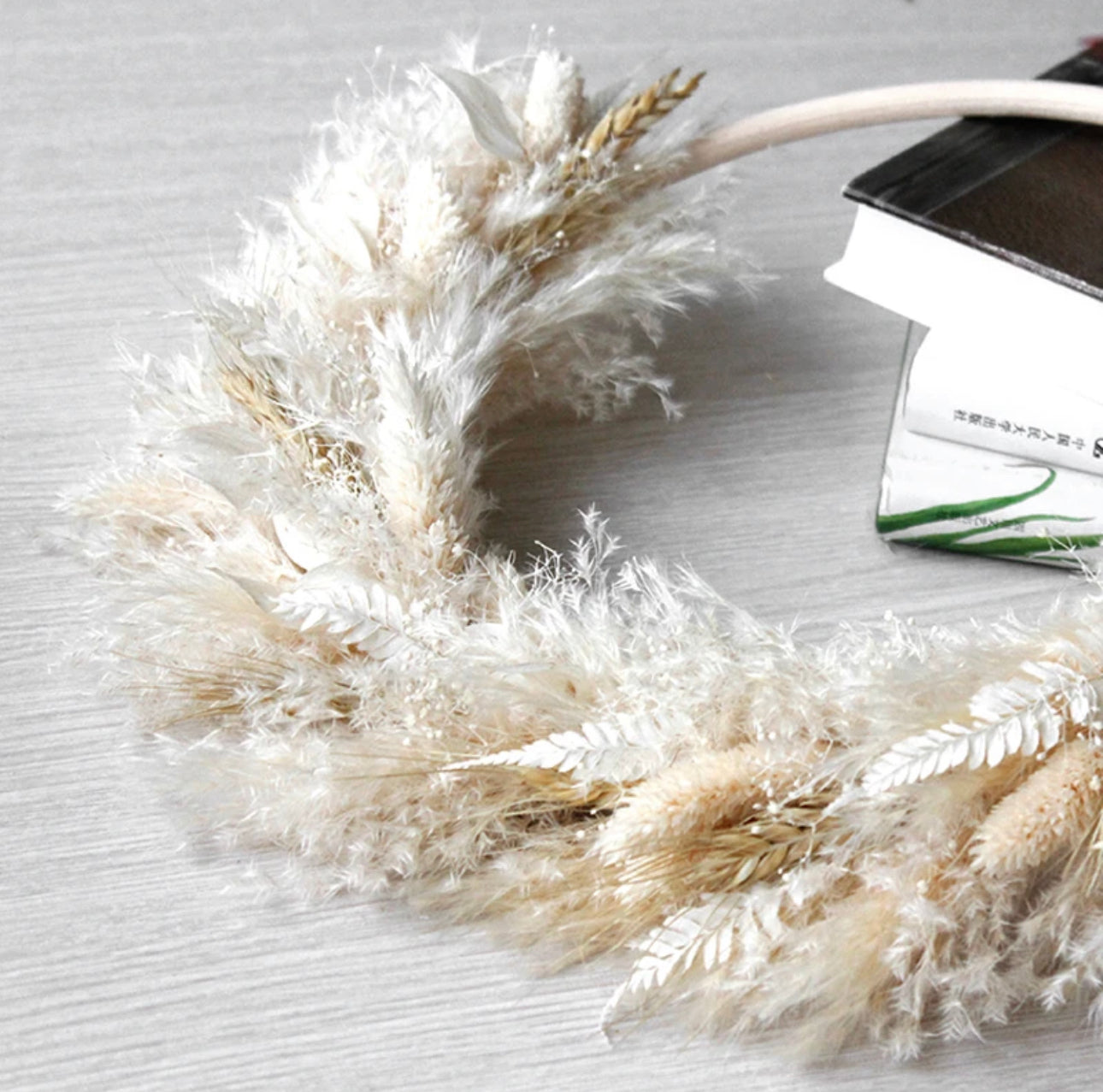 The Boho Pampas Halo Wreath is one of Lu home's classic Boho Chic items. Adorn your wall, matle or doorway with this minimal and elegant handmade wreath. Handcrafted with real natural preserves pampas, florals and leaves. A natural and neutral arrangement of colors with a variety of textures. The varying hues of cream, white, beige and light wood will brighten up any room. The different textures offer this stunner a lot of movement and grace ideal for any placement in the house, made by hand ensuring each Lu home wreath & halo is rich in quality and fluffy goodness.