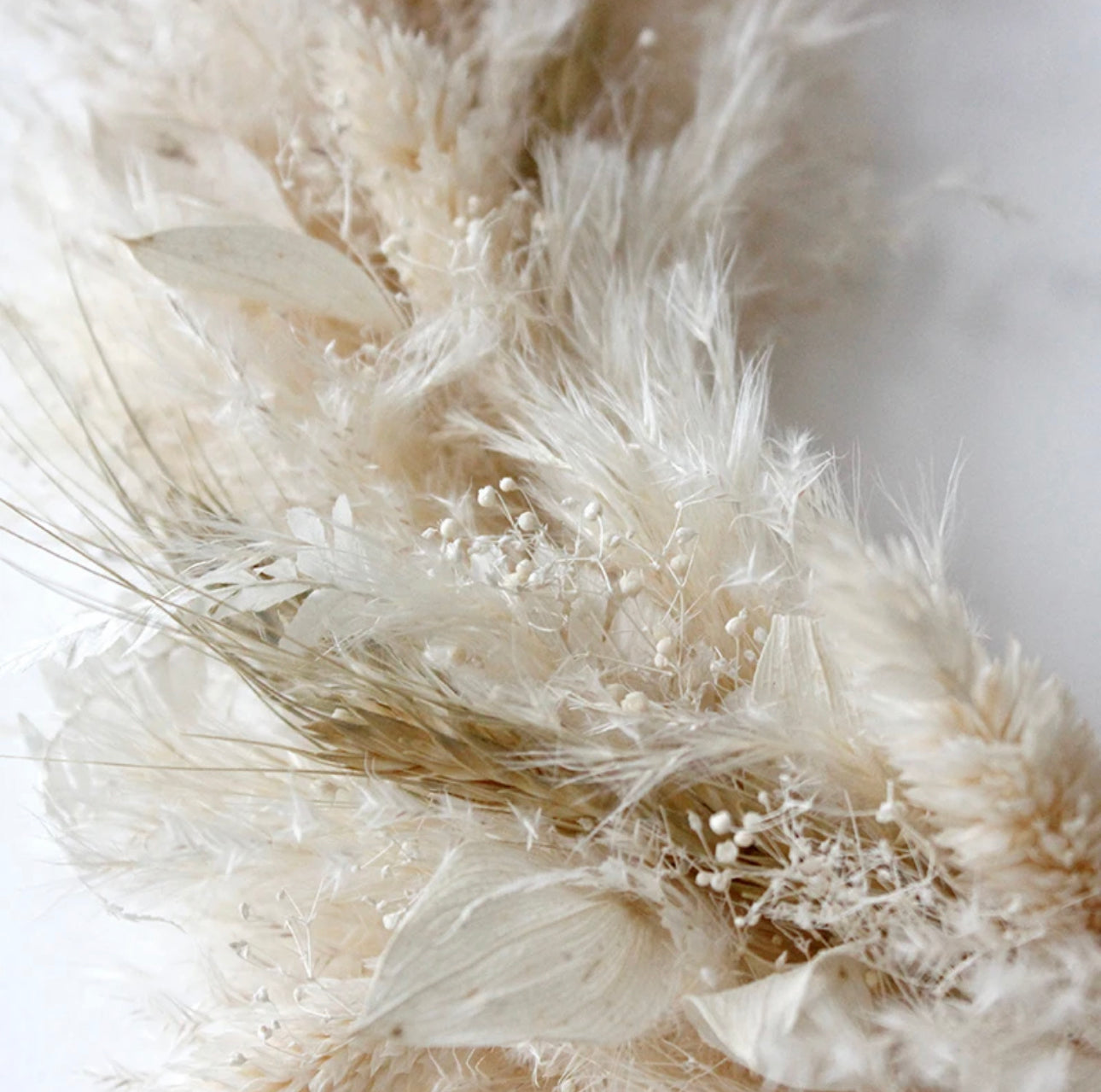 Natural preserved Pampas, Wheat, Gem Grass, Babys Breath, Fern Leaf and Orange Leaf.