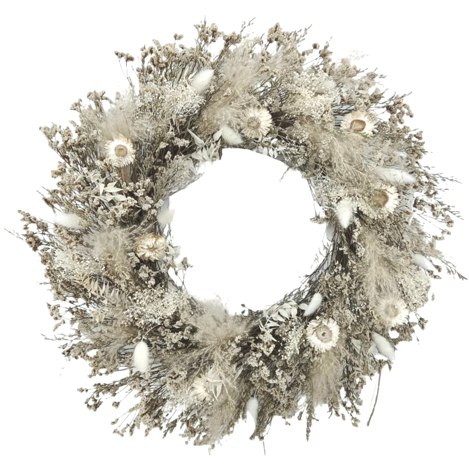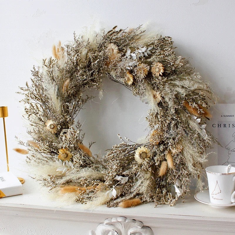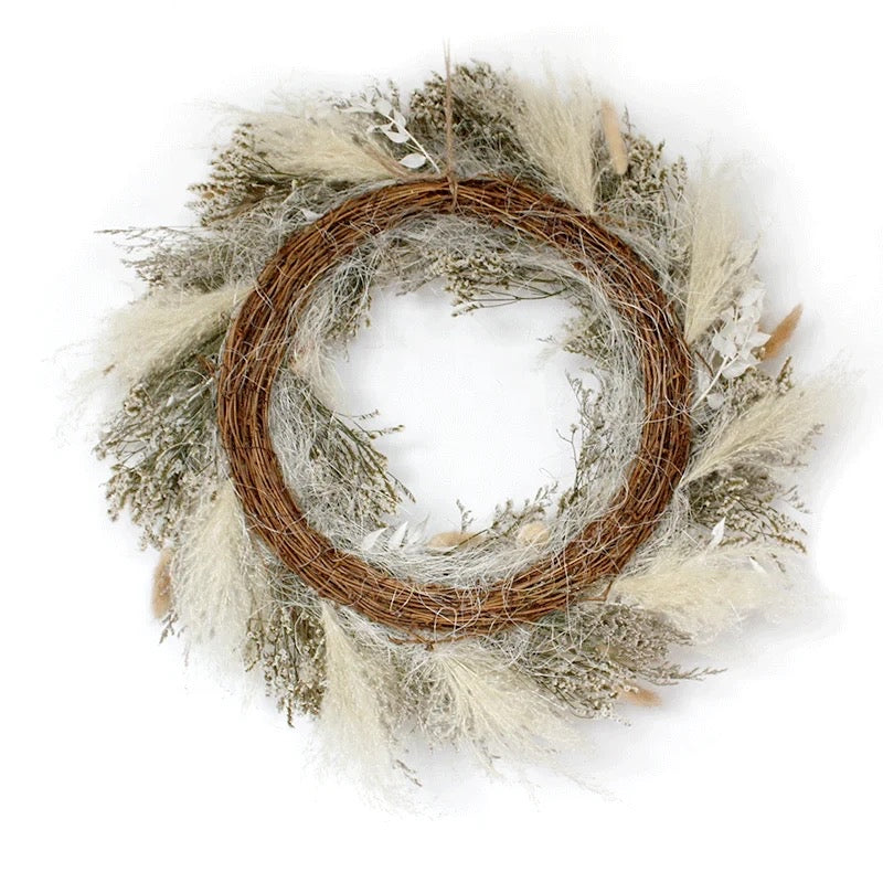 Natural preserved Pampas, Baby Breath, Crystal Flower, Limonium, Lagurus Ovatus, Ruscus, and Chrysanthemum.