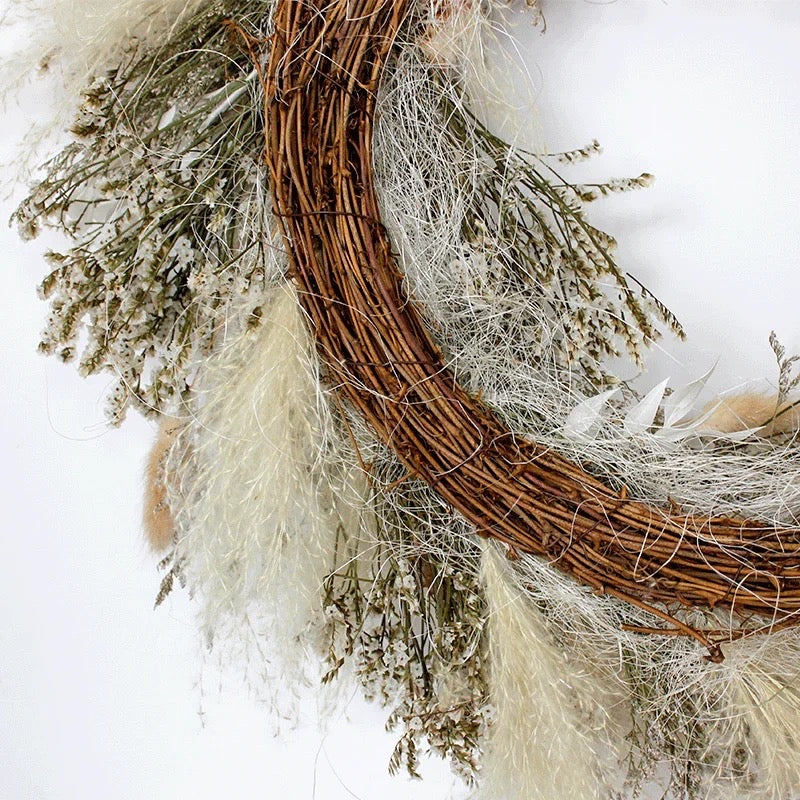 This handmade dreamy, barely tamed wreath provides a moment of delicacy and attention to the front door or adorn a bare wall or shelf inside.