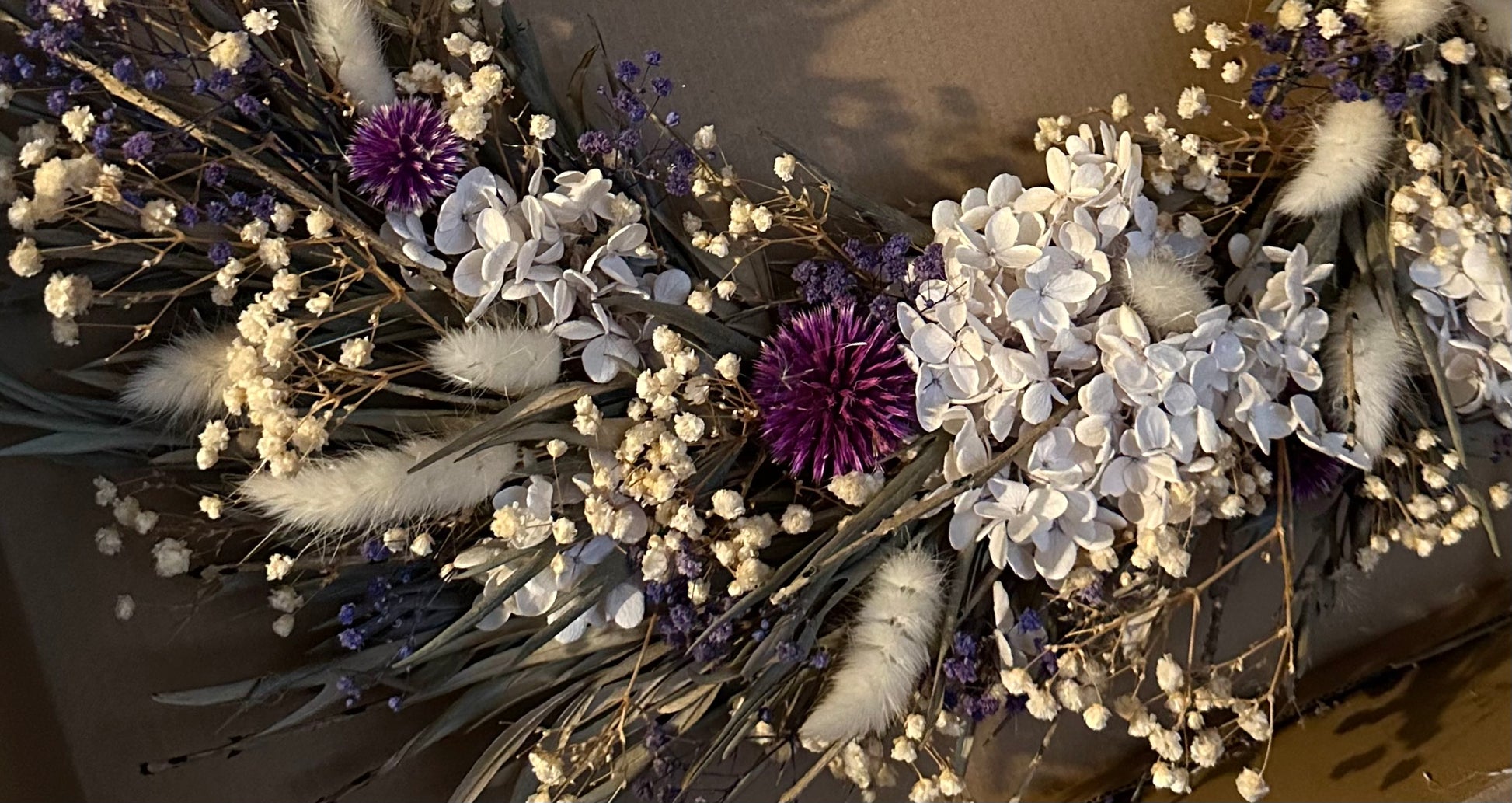 Lush and rustic, beautifully handcrafted with preserved natural florals featuring soft hues of violet, lavender, periwinkle blue, blue, green and white. The soft colors and variety of textures make a bold statement that is still minimal and understated.