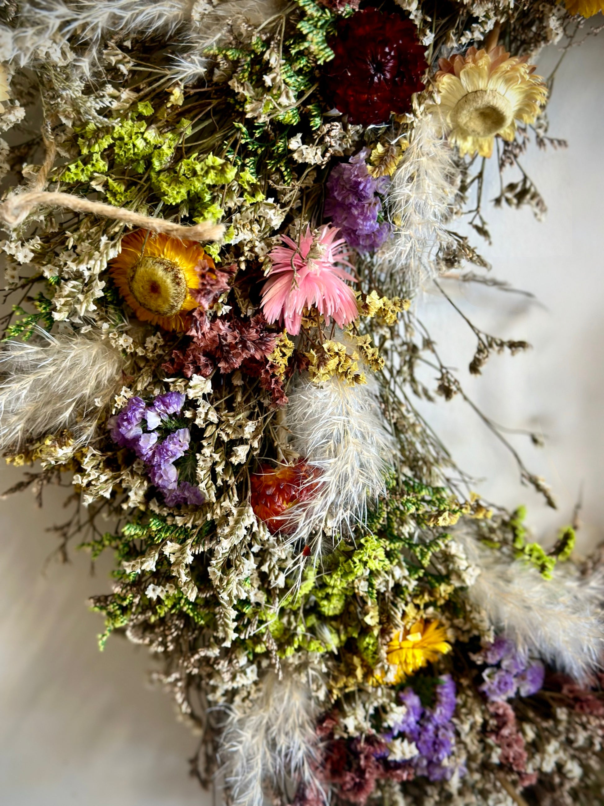 Crafted with natural preserved florals, The Meadows Wreath features a stunning blend of Chrysanthemum, Limonium, Crystal Flower, Myosotis, and Pampas – creating a lush, full appearance that exudes beauty and vitality. The wreath boasts a 22-23” diameter with robust foliage and vibrant hues that make it a standout piece in any space.
