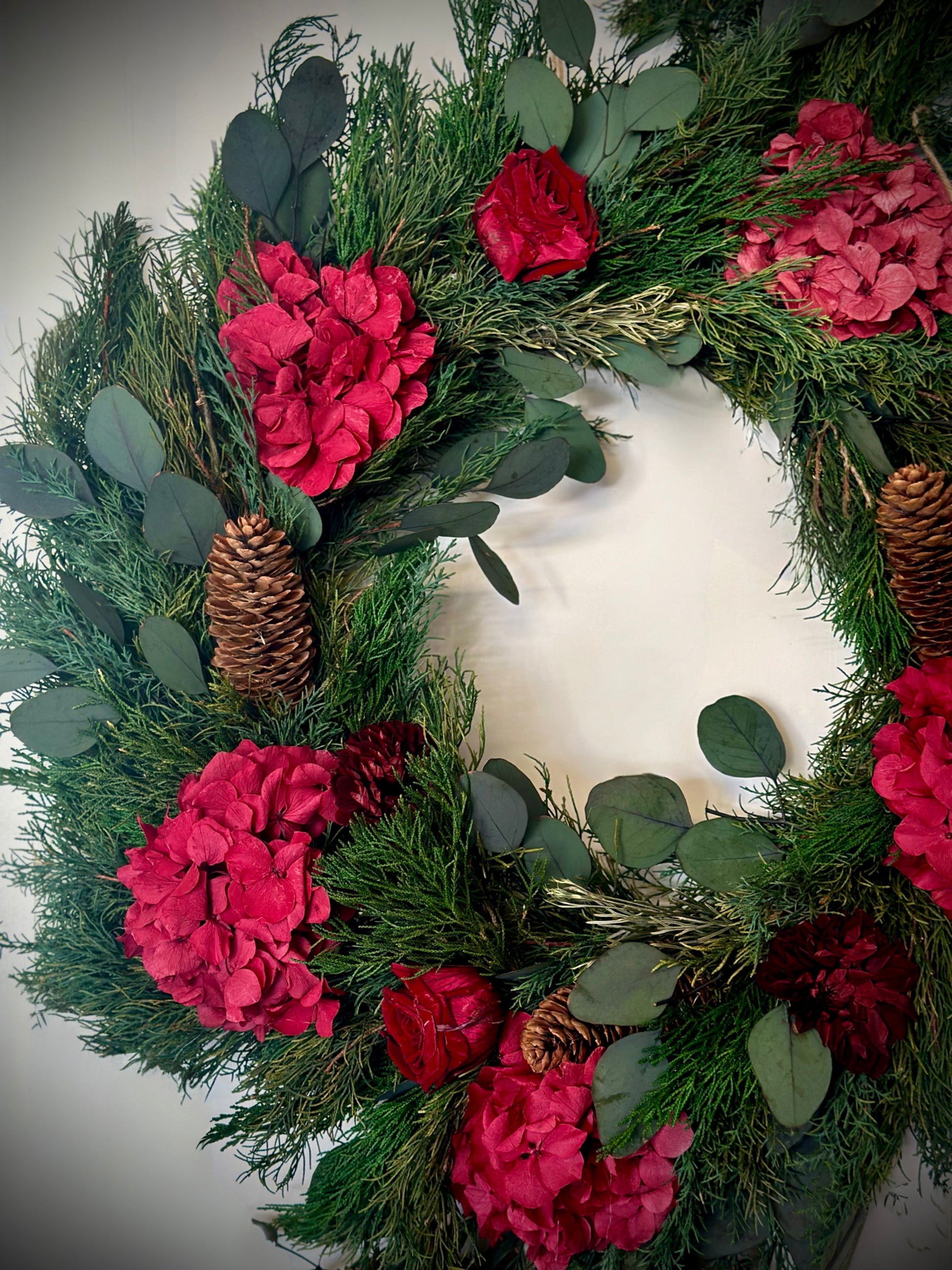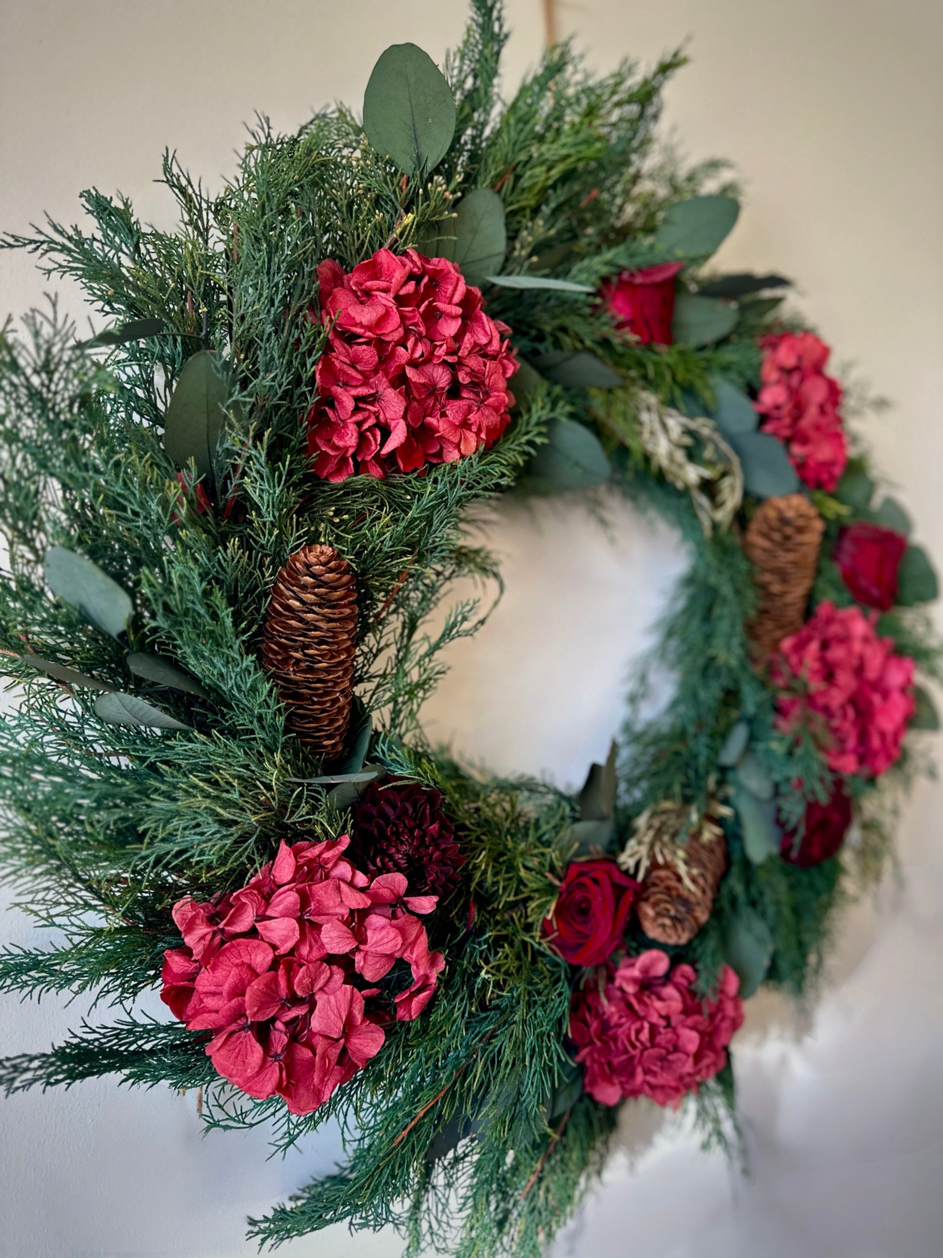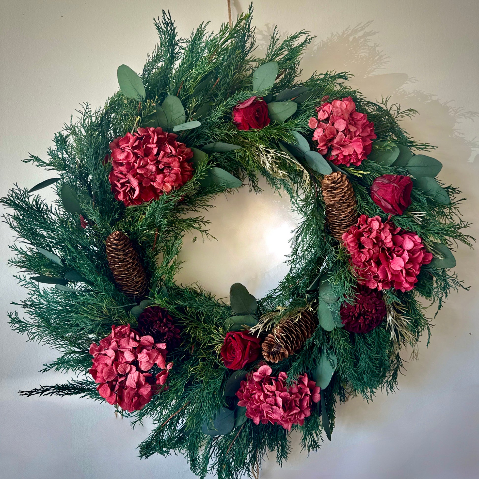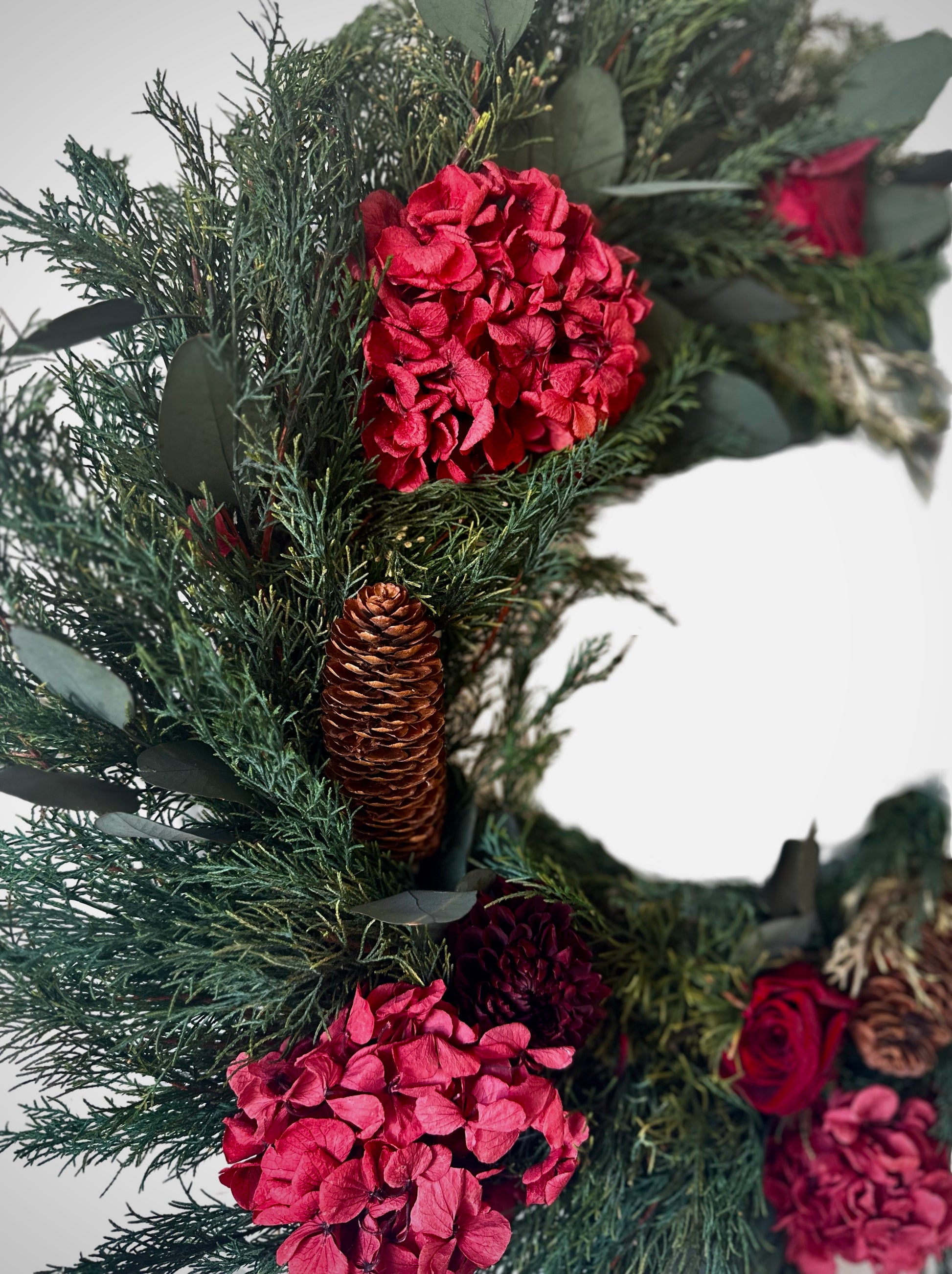 The Rosey Fir wreath features natural preserved leaves and florals - including: Hydrangea, Grevillea, Eucalyptus, Pine Cone, Dahlia, Roses, Sabina Chinensis & Juniperus Chinensis.